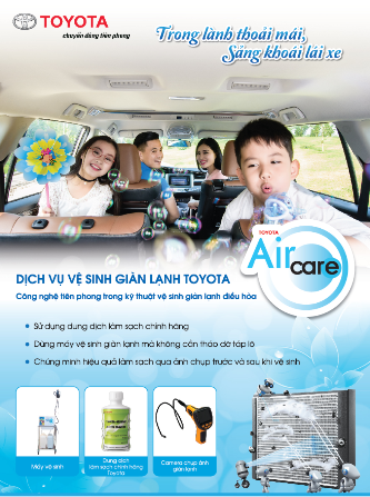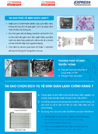 Dịch vụ vệ sinh giàn lạnh điều hòa chính hãng Toyota, sử dụng Máy vệ sinh tự động với thiết bị chuyên biệt có thể làm sạch tận bên trong giàn lạnh mà không cần tháo dỡ táp lô với thời gian cho một lần dịch vụ chỉ 1 tiếng đồng hồ. Dịch vụ này cũng sử dụng dung dịch làm sạch giàn lạnh chính hãng Toyota, hoàn toàn an toàn cho kết cấu bề mặt giàn lạnh cũng như sức khỏe con người. Sau khi thực hiện, khách hàng có thể kiểm nghiệm hiệu quả làm sạch do thiết bị có thể chụp ảnh so sánh giàn lạnh trước và sau khi làm sạch. Công nghệ vệ sinh giàn lạnh tiên tiến này đã được chứng nhận bởi Tập đoàn Toyota Nhật Bản (TMC) và đã áp dụng ở nhiều nước trong khu vực như Thái Lan, Đài Loan, Singapore, Hồng Kông, Philippines …